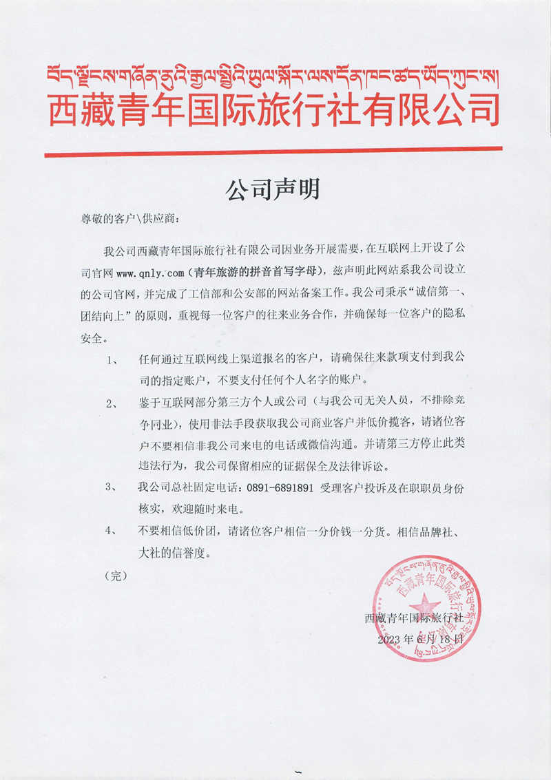 西藏青年国际旅行社因业务发展需要,原地址拉萨市天海路6号迁移到新地址拉萨市柳梧新区长兴都汇2-203
