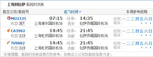 以上就是上海飞拉萨的航班时刻表,起飞时间,到达时间,及固定航班日期。