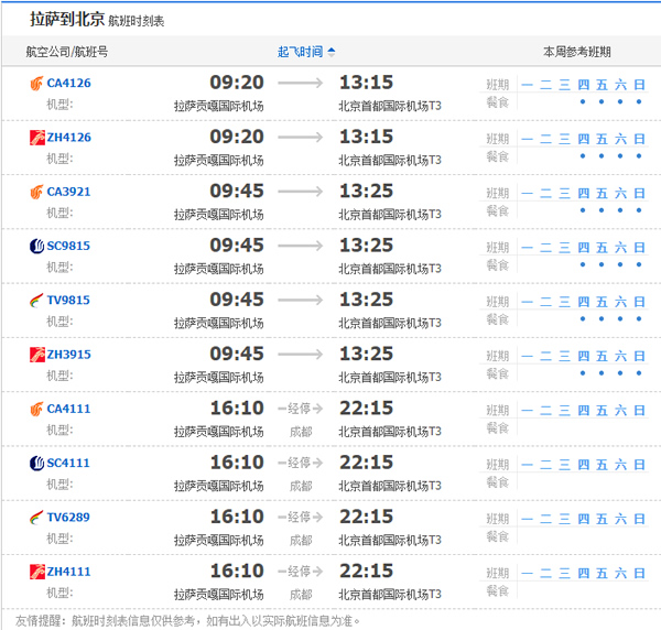 拉萨飞北京的直达航班有4个,主要航班号有中国国航CA3915、CA4111,深圳航空ZH4111,更多详细的直达航班时刻表如下图所示: